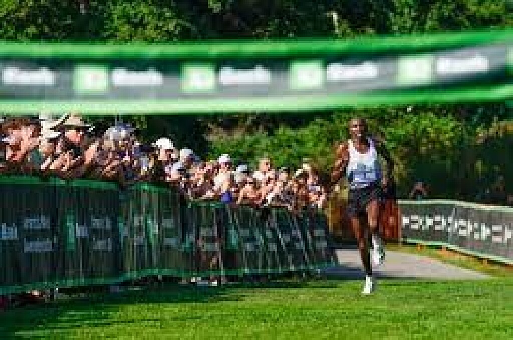 True’s absence paved the way for Mathew Kimeli, 24, of Kenya to run away from the men’s field. Hampered only by a brief entanglement with yellow caution tape after he turned onto Shore Road in Mile 4, Kimeli crossed the line with arms upraised in a winning time of 28:39.