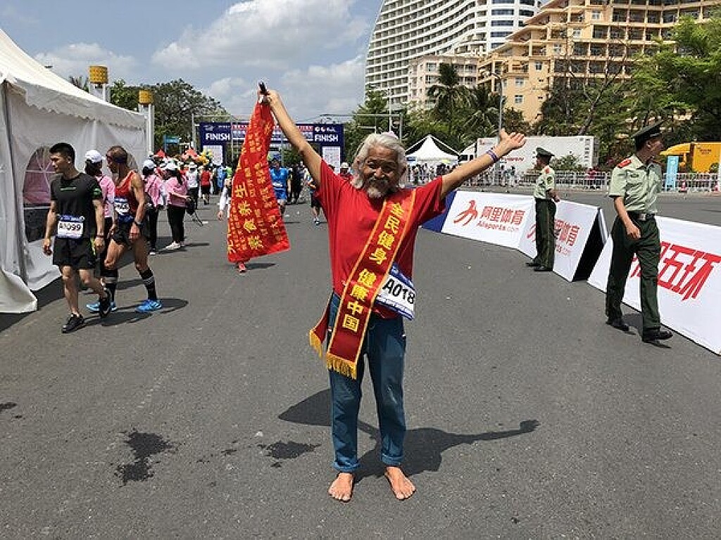 Jiase, known by his nickname “the barefoot fairy” because of his unique running style, completed the marathon in five hours and 16 minutes wearing his signature pink T-shirt, blue singlet and rolled-up sweatpants. He has a barefoot best of 3:06 from the Beijing International Marathon in 2007, when he was 50.
