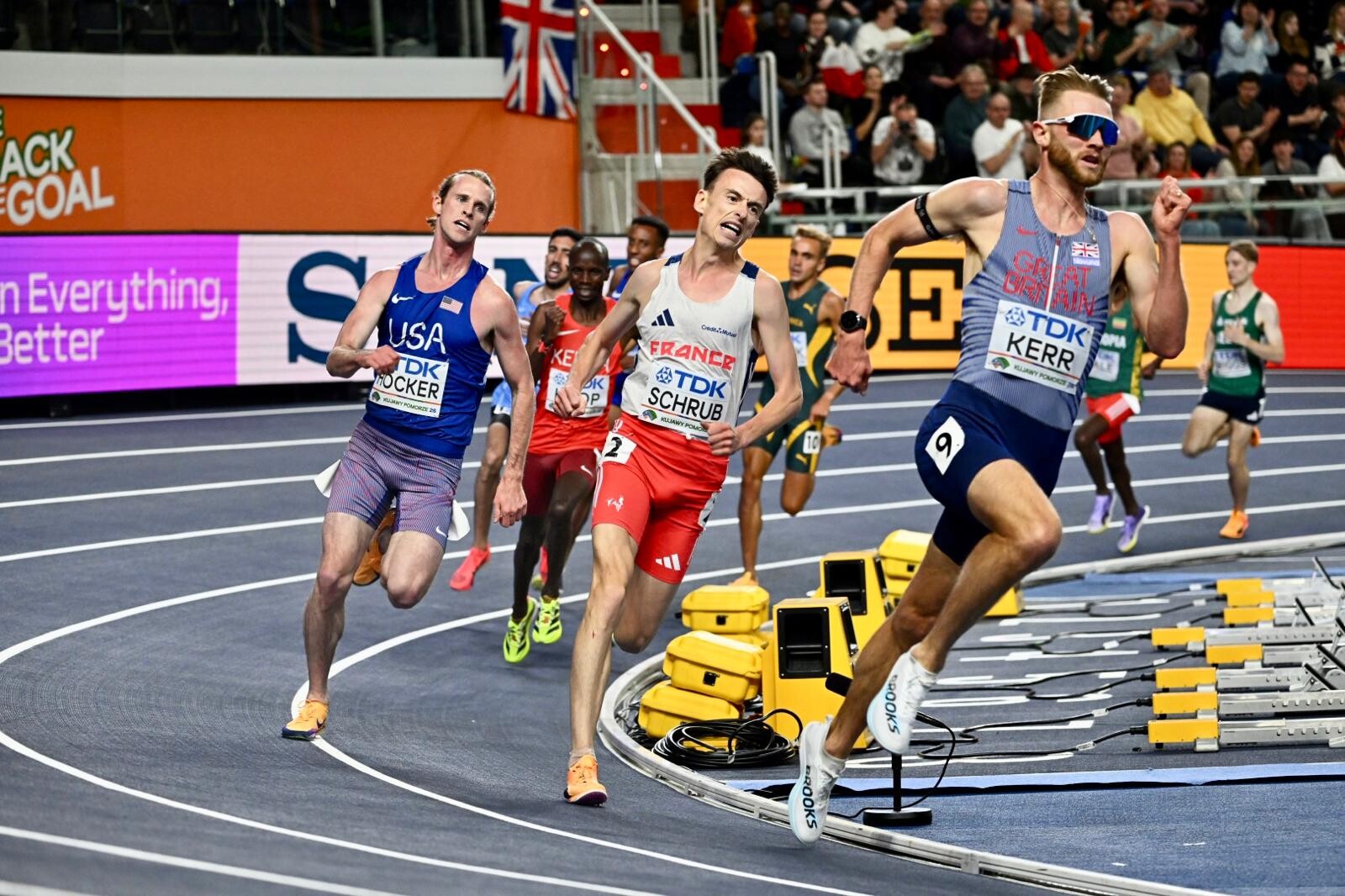 The British star surged to victory in a breathtaking men’s 3000m final at the World Athletics Indoor Championships, clocking a razor-sharp 7:35.56 in a race that unfolded with relentless intensity. It was not merely a win—it was a statement. In a finish so tight it demanded a second glance, Kerr edged out the fast-closing Cole Hocker, who stopped the clock at 7:35.70, while France’s Yann Schrub followed a heartbeat later in 7:35.71.