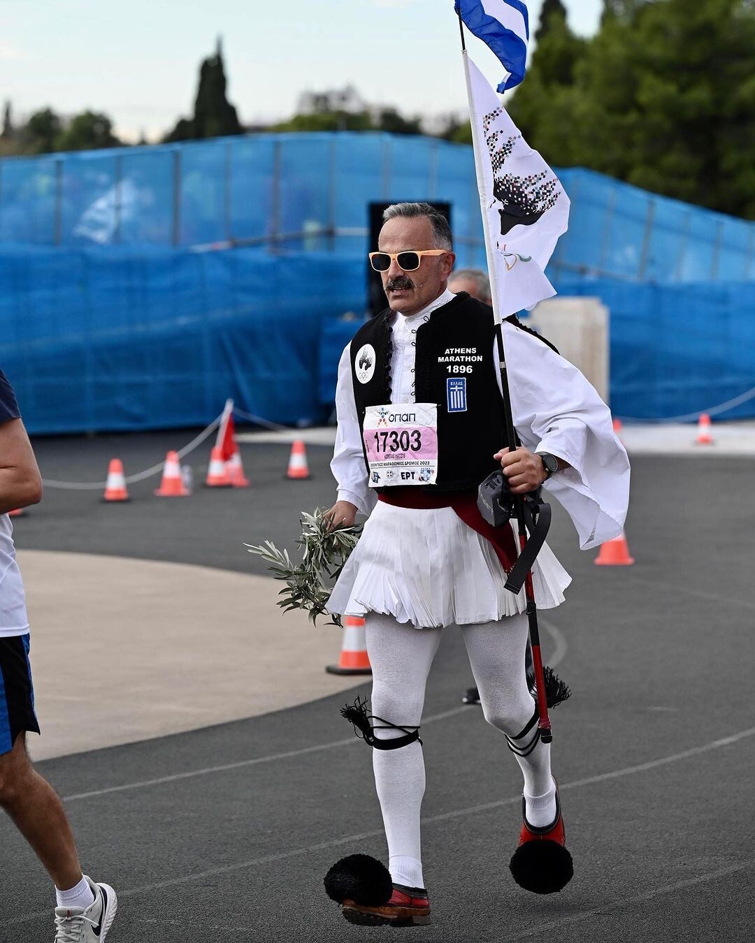 “My world collapsed,” Hatzis wrote on Facebook. “My traditional Greek costume and matching shoes were snatched from me. My Olympic Truce flag, my running outfits and all I need for one week. I did not come all the way from my home in NL to eat, drink and sleep in Athens.”Hatzis’s traditional Greek costume is the distinctive uniform of Greek soldiers called Tsoliades–right down to the fustanella (a kilt-like garment) and the tsarouchis (flat shoes with pompoms). The Olympic Truce flag bears a drove with a traditional Olympic flame, symbolizing peace and human spirit.