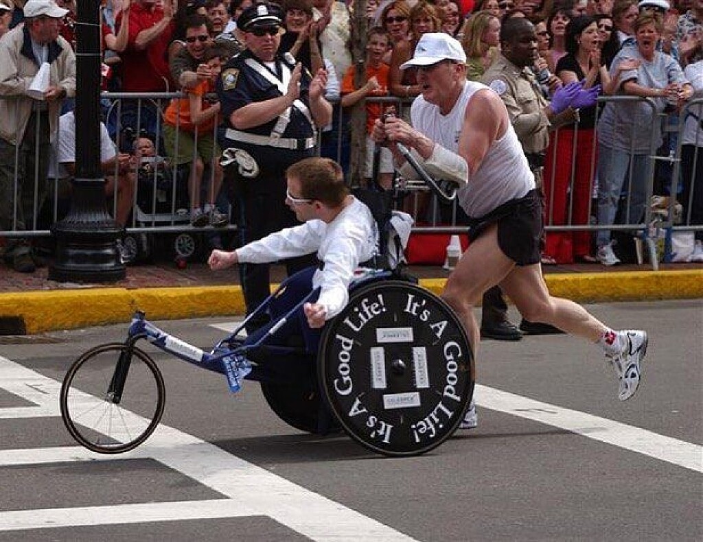 Hoyt had cerebral palsy, which left him a quadriplegic. In 1977, he told his father, Dick, that he wanted to take part in a charity run for a lacrosse player who was paralyzed in an accident. Dick pushed his son for the race, and after, he told his father, “When I’m running, I don’t feel handicapped.”