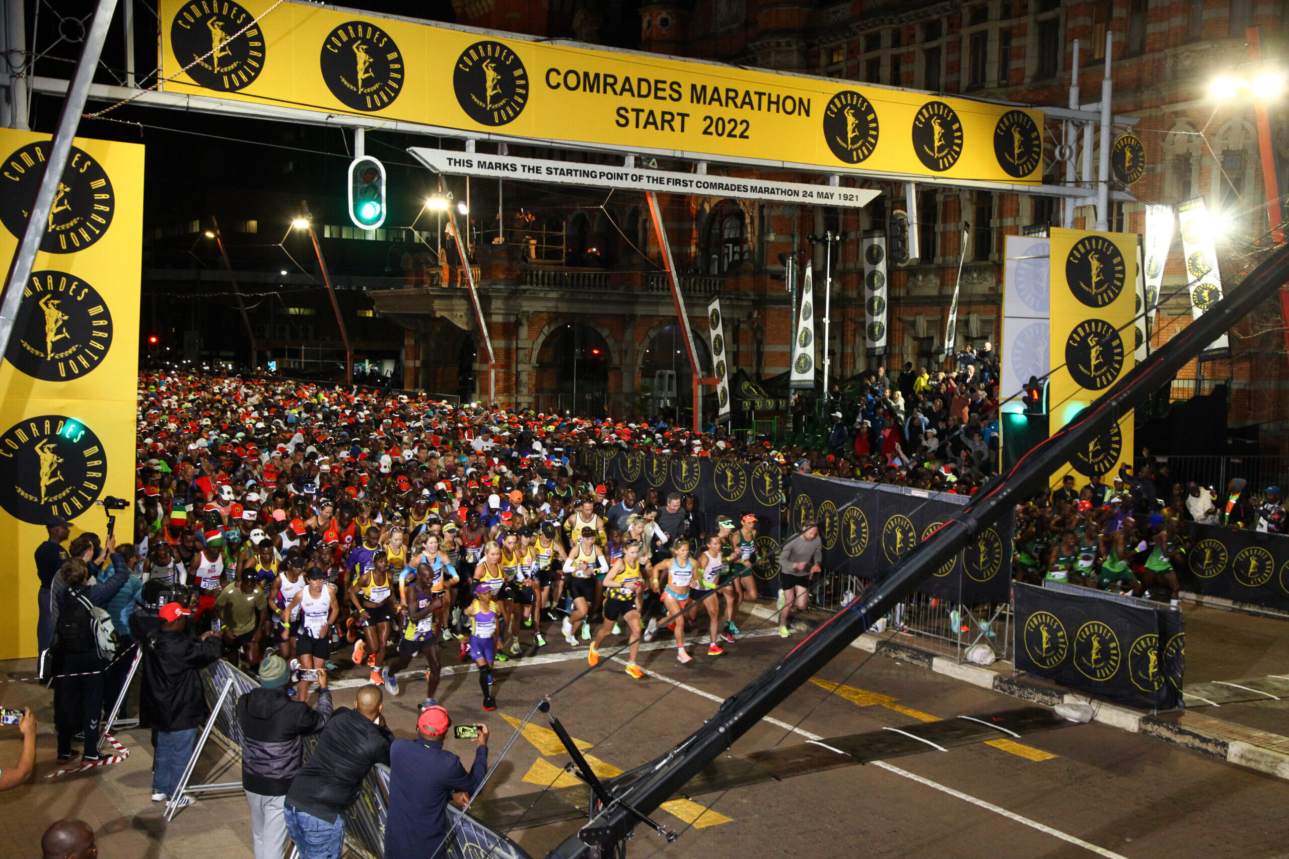 The 98th edition of the Comrades, run from Pietermaritzburg to Durban, featured a record Down Run field of 22,677 qualified entrants. For the first time in event history, organizers introduced a split start for safety and improved flow, with two groups starting 15 minutes apart.