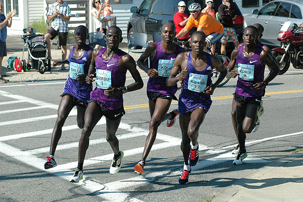 The women’s race broke early with a pack of 30 dropping to seven by the second mile. Iveen Chepkemoi, a young 24-year-old talent from Kenya, who trains in Colorado Springs, put a gap on Edna Kiplagat, Emily Durgin, Fiona O’Keeffe and past Falmouth champion Diane Nukuri. By the halfway point, the race was between Kiplagat, a Boston, London and New York City Marathon champion, and Chepkemoi, with the second pack fading by 20 seconds. At mile four, Kiplagat pulled away as Chepkemoi got caught by the chase pack.