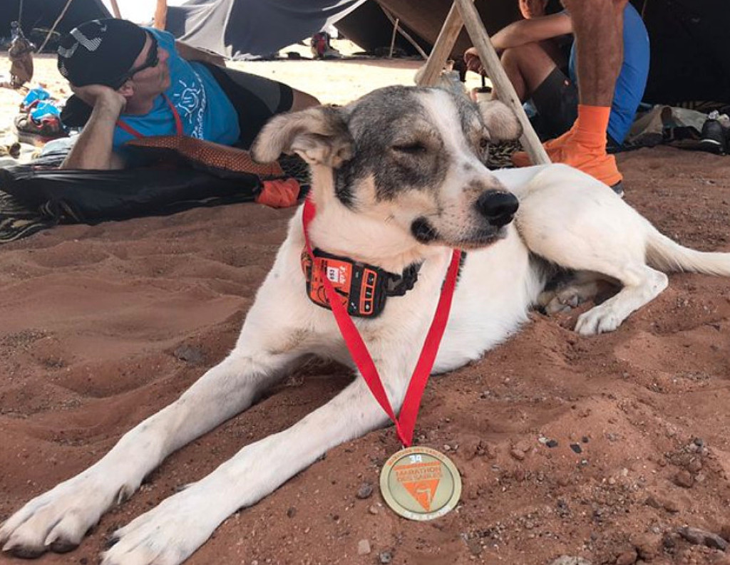 The hound, nicknamed Cactus, wandered onto the course on day two of the Marathon des Sables in Morocco.