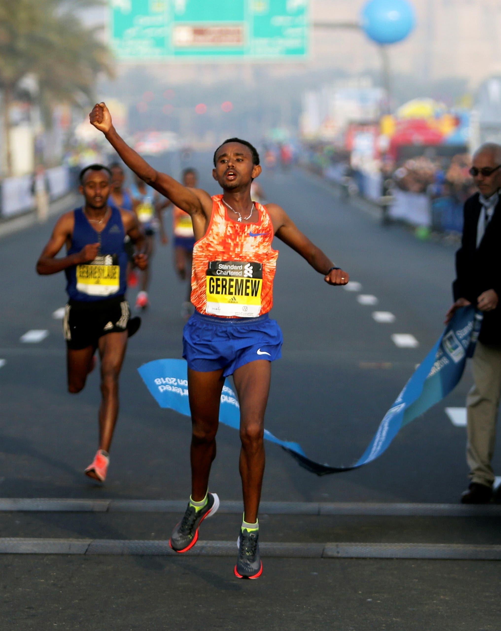 Ethiopia's Mosinet Geremew won the Standard Chartered Dubai Marathon with a course record of 2:04:00 in one of the most thrilling finishes in marathon history.