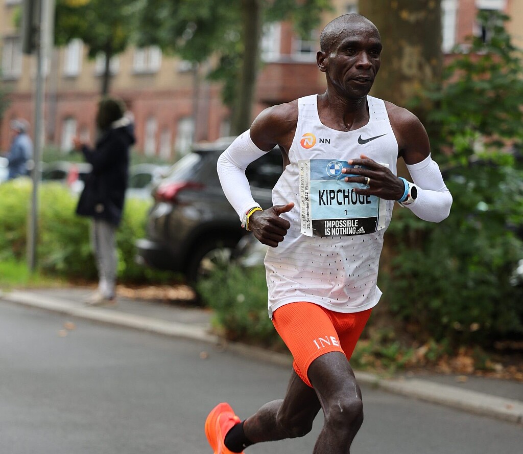 Led by a trio of pacers, a pack of seven men blazed out at world record pace, traveling the first 5K in 14:16 (4:36 pace). By 15K, the pace had slowed, but only four men (and two pacers) remained: Kipruto, Kiplagat, and Ngetich, and Kenyan Eliud Kipchoge, 39, the two-time Olympic champion and former world record holder.