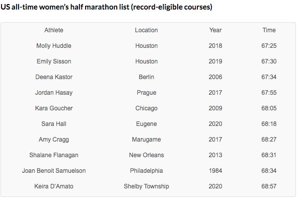Her most impressive performance came in last month’s Michigan Pro Half Marathon, where she clocked 68:57, 47 seconds ahead of runner-up Emma Bates, a 2:25 marathoner who finished 7th at the Olympic Trials. That made D’Amato the second-fastest American half marathoner on the year, behind Sara Hall, and 10th on the US all-time list. She is now in very elite company.