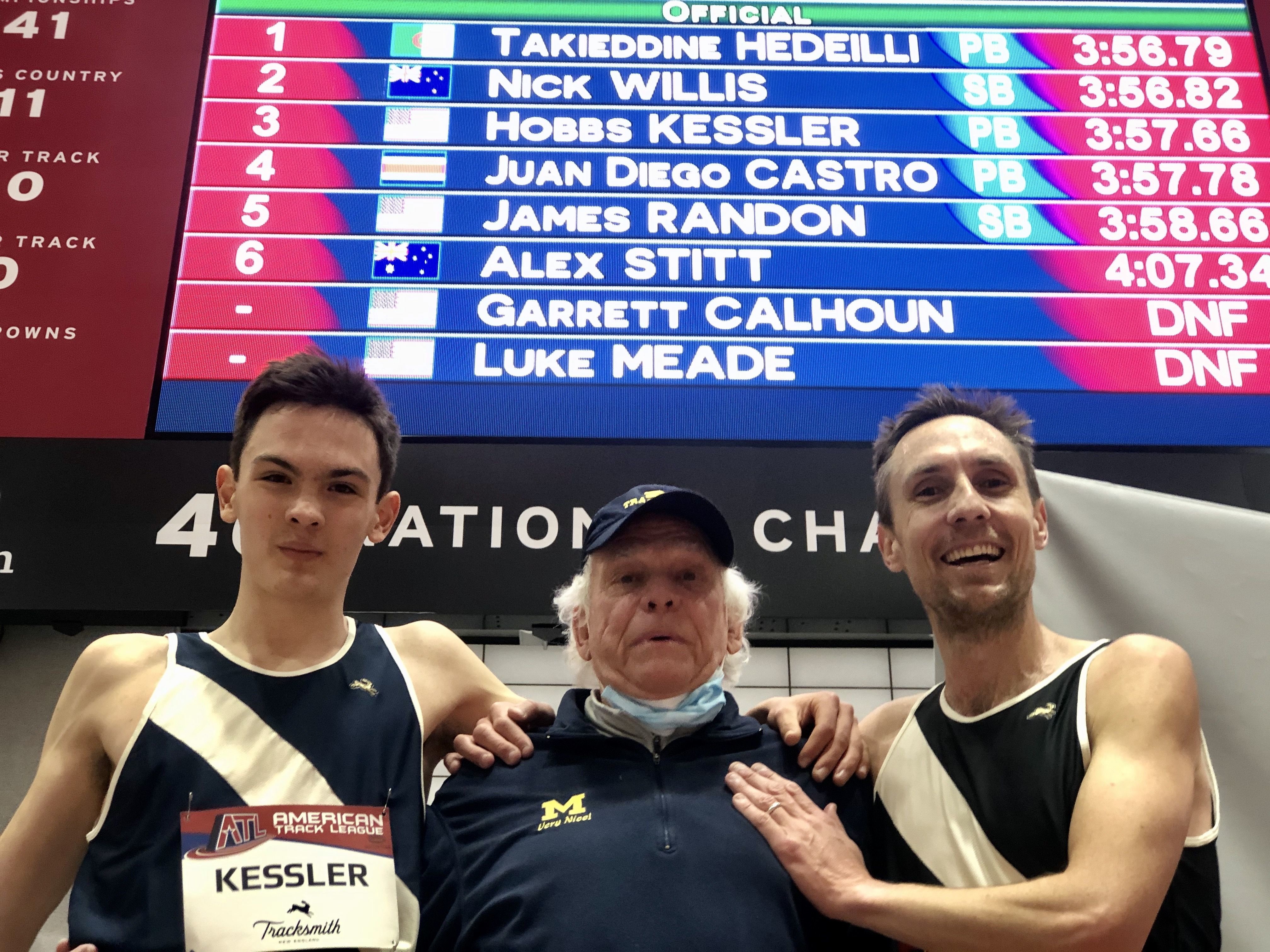 Kessler, who was last in the lead pack of ten with 200m to go, moved up well the final 100 meters, and threw up his hands just before the finish line as he saw the clock and finished 5th in a race won by reigning US champ Craig Engels in a personal best of 3:33.64. Engels, the 2019 US indoor/outdoor champion and a World Championship finalist, entered tonight with a pb of 3:34.04 — barely faster than what Kessler ran.