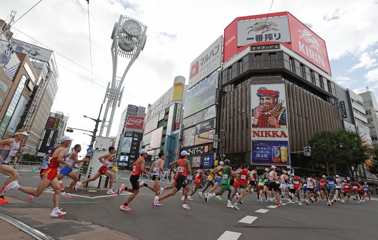 Runners move past the Susukino district while competing in the men’s marathon.