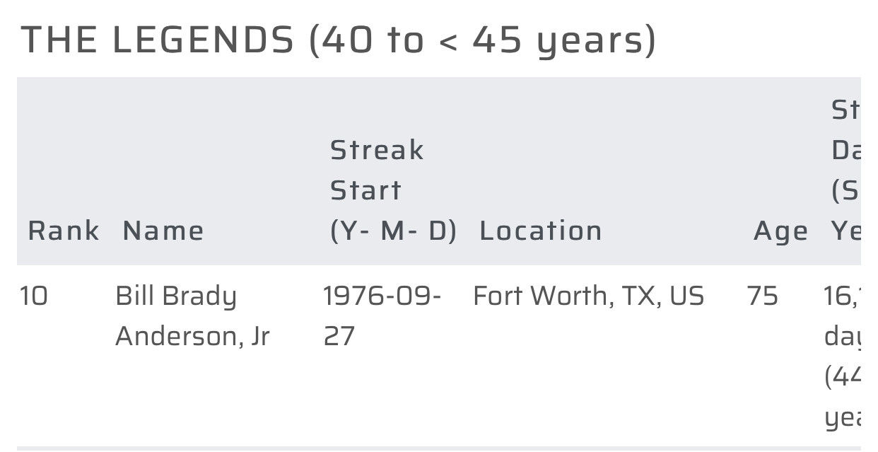 In 2018 he shared his secrets with MBR. Bill Anderson (72) started his running streak on September 27, 1976 in Fort Worth Texas. He has run at least one mile everyday since then. He is currently number ten on the Official USA Active Running Streak List.