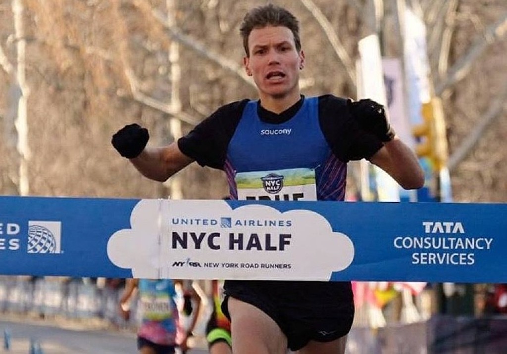 His final kilometers were controlled, powerful, and confident, culminating in a 59:01 finish that rewrote the course record on one of America’s fastest half-marathon routes.