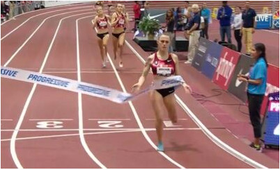 Today, a Bowerman TC man finally got into the act as Josh Thompson (3:44.07) held off defending champ Craig Engels (3rd, 3:44.62) and the surprising Nick Harris (2nd, 3:44.57) in the 1500 to earn BTC’s first men’s indoor title since 2016. Coupled with another dominant Houlihan victory, it gave BTC a sweep of the metric mile at this year’s USATF Indoor Championships and capped off a successful weekend that saw Jerry Schumacher’s outfit sweep the top three spots in both the women’s 1500 and 3000.
