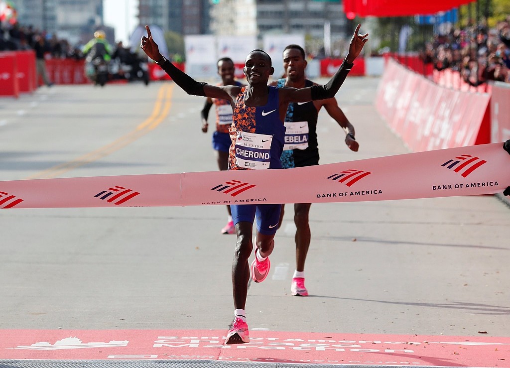 more...2019 Boston winner Lawrence Cherono made another last 400m sprint today in Bank of Chicago Marathon in a group of 4 athletes clocking 2:05:45.He was followed closely by Dejene Debela 2:05:46 and Asefa Mengstu 2:05:48.Mo Farah finished 8th in 2:09:58.