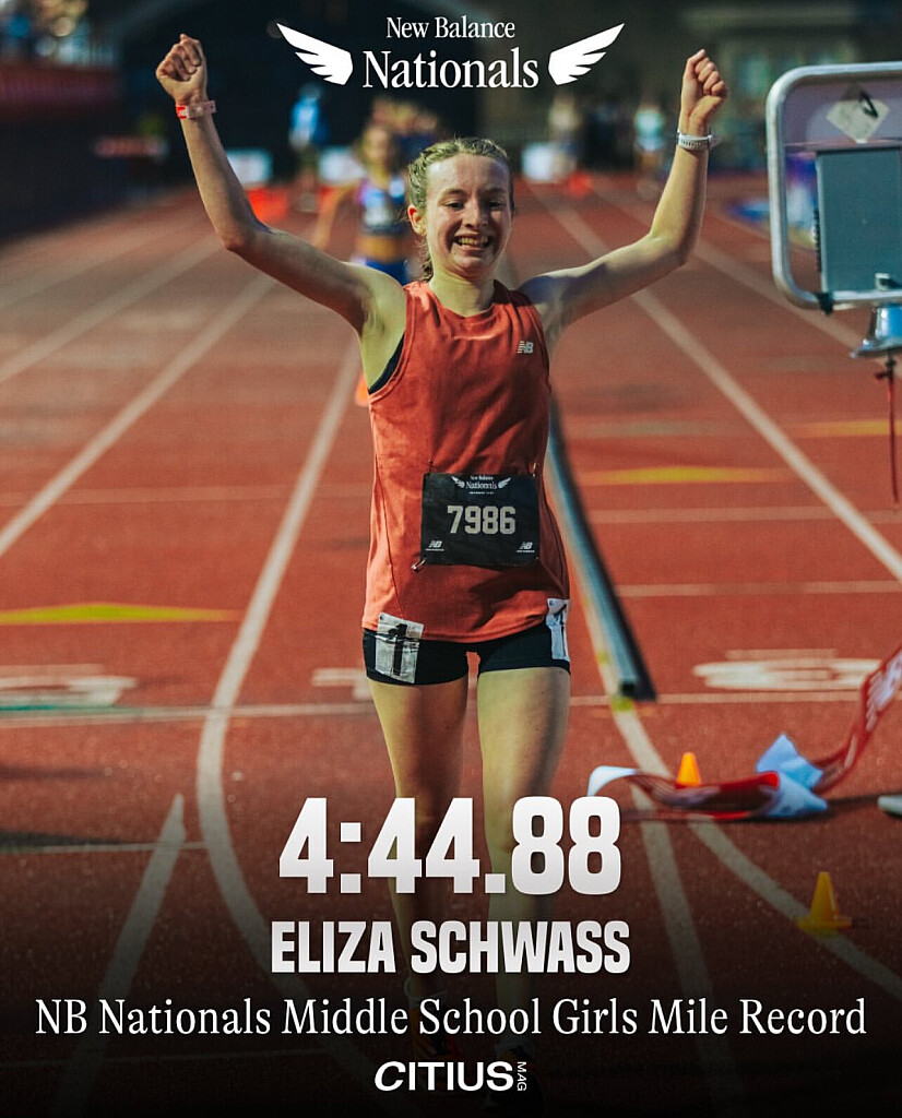 Held at the historic Franklin Field, the race featured some of the nation’s most promising young runners. Yet even among elite competition, Schwass stood out. Her 4:44.88 finish wasn’t just fast—it was record-breaking, officially setting the New Balance Nationals Middle School Girls Mile Record.