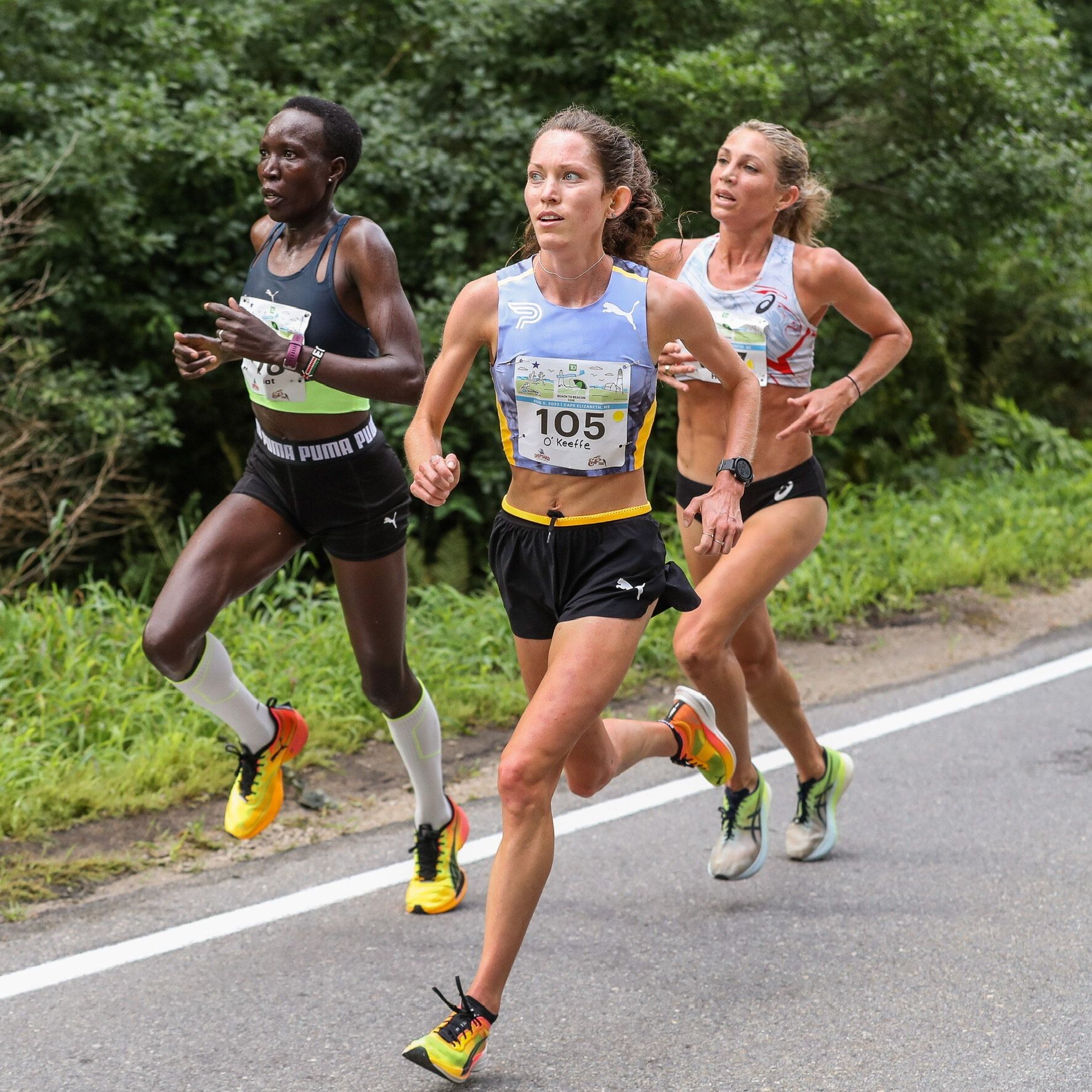 Just before the clock showed 27 minutes, Teferi put in a surge and moved a stride ahead, but Obiri – who won the Boston Marathon in April and the NYC Half in March – was quick to cover it. A minute and a half later, it was Obiri’s turn to push the pace as they hit another hill, but again, Teferi – runner-up behind Obiri at the NYC Half – matched it and they continued to run shoulder to shoulder.