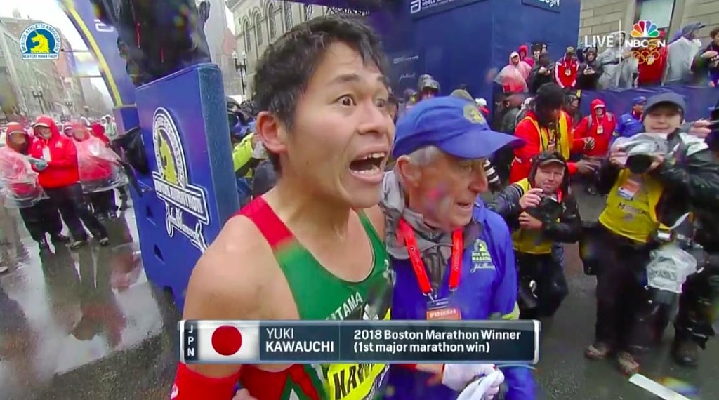 In a gripping race held in harsh conditions, Kawauchi put in numerous surges with his final effort proving decisive. He crossed the finish line in 2:15:58 to beat world champion Geoffrey Kirui by more than two minutes.