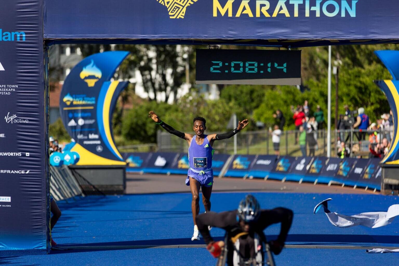 Mitku Tafa Dekeba was the first of the three to suffer as they rounded the final bend and began the headwind slog along Beach Road in Sea Point towards the Green Point finish line. This left Kebede Gebre and Tola in a two-way tussle for the title. Striding into the wind the younger Tola brother, whose elder brother Tamirat Tola was crowned Olympic Marathon Champion in Paris, was able to dig deep and surge clear.