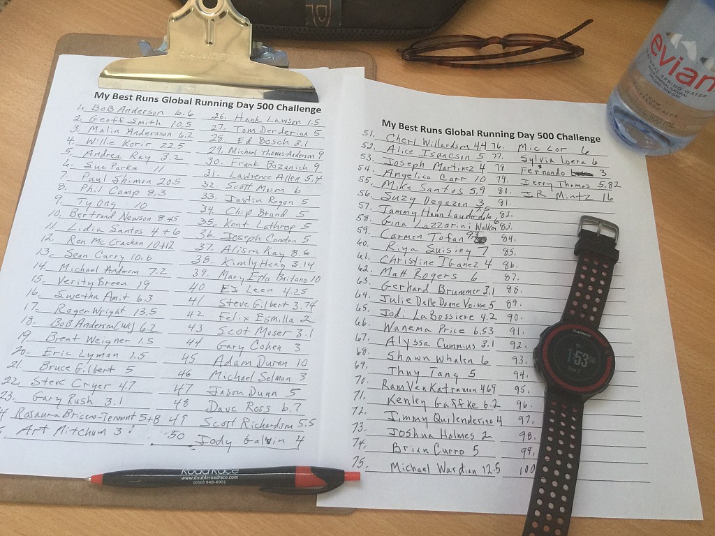 In the end, 80 people posted 560.12 miles for our My Best Runs Global Running Day 500 Mile Challenge. We did it. We showed the world that a group of people can come together (with no notice) from all over the world and run the equivalent distance from San Francisco to San Diego.