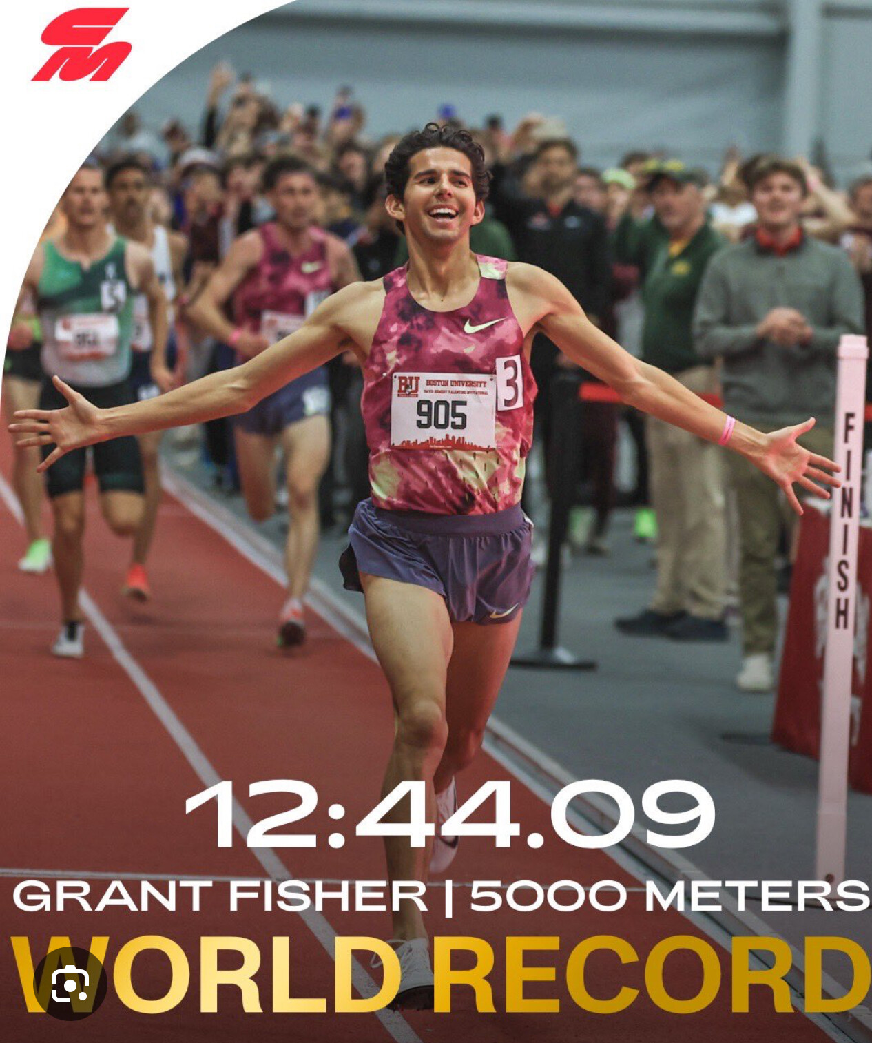 The U.S. 5,000m and 10,000m record holder Grant Fisher finished fifth with a new indoor 3,000m personal best of 7:35.82.