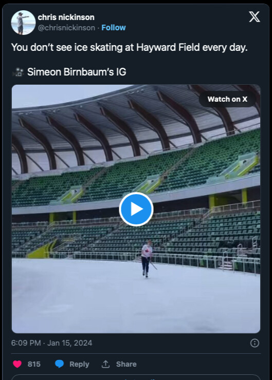 The video was posted to Oregon freshman Simeon Birnbaum’s Instagram story on Monday, where he was also seen sporting a Team Canada kit T-shirt. Although Birnbaum is from South Dakota, he has Canadian roots, having spent his early years in Alberta, where he learned to skate, according to Runnerspace. He transitioned from hockey to track in his early teenage years and is now a sub-four-minute miler with the University of Oregon track and field team under coach Jerry Schumacher.