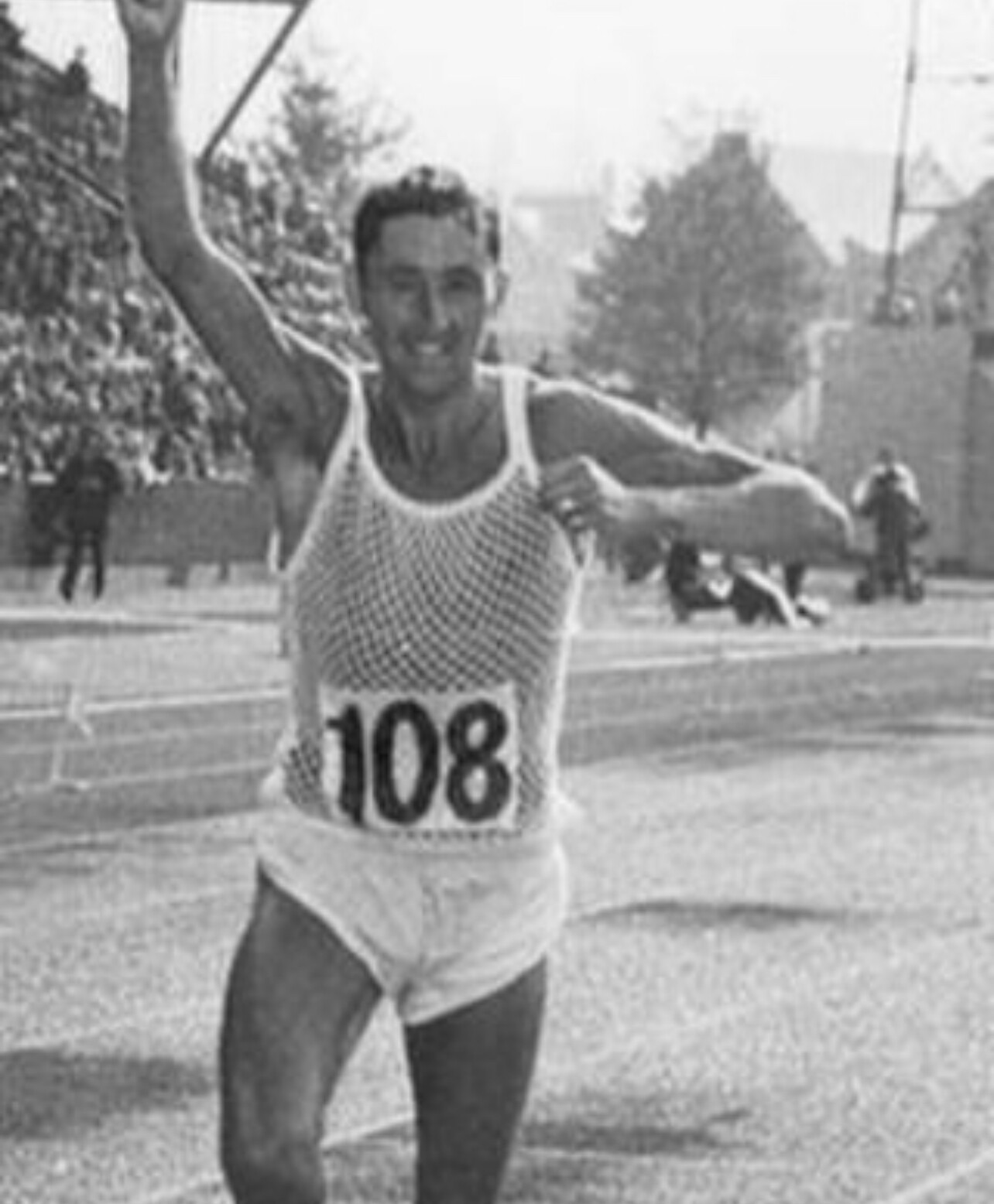 Sprinting down the track with trademark aggression, Vladimir Kuts dominated the 1956 Olympics in Melbourne, winning both the 5,000m and 10,000m. Eric’s photo selection highlights Kuts’ unmistakable form and ferocity—a reminder of Eastern Bloc distance dominance during the Cold War era.