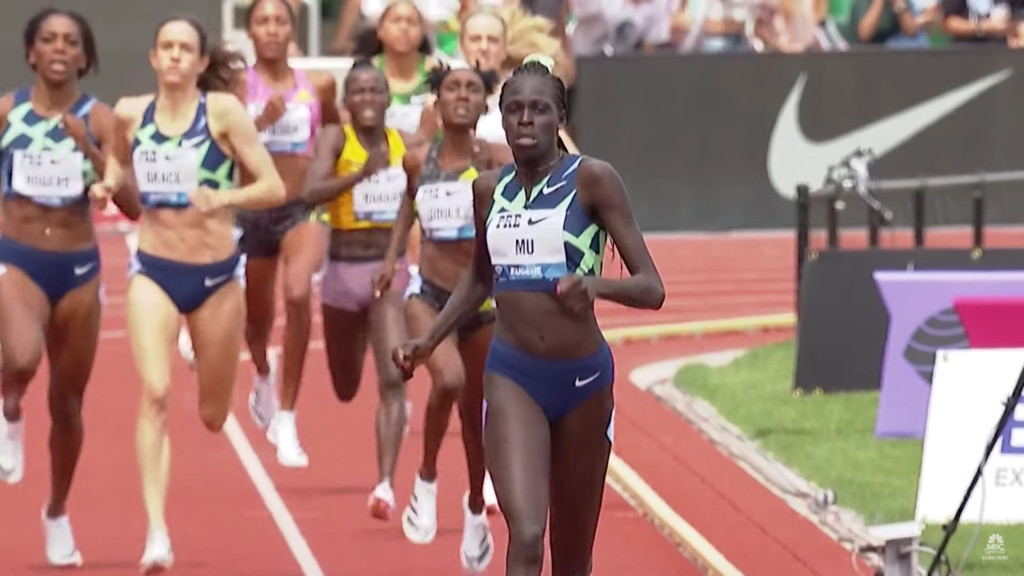 Mu led from start to finish, covering the first lap in 54.60. She beat the field by 2.5 seconds as her fellow American Kate Grace finished second in 1:57.60 and Jamaican Natoya Goule was third in a time of 1:57.71.