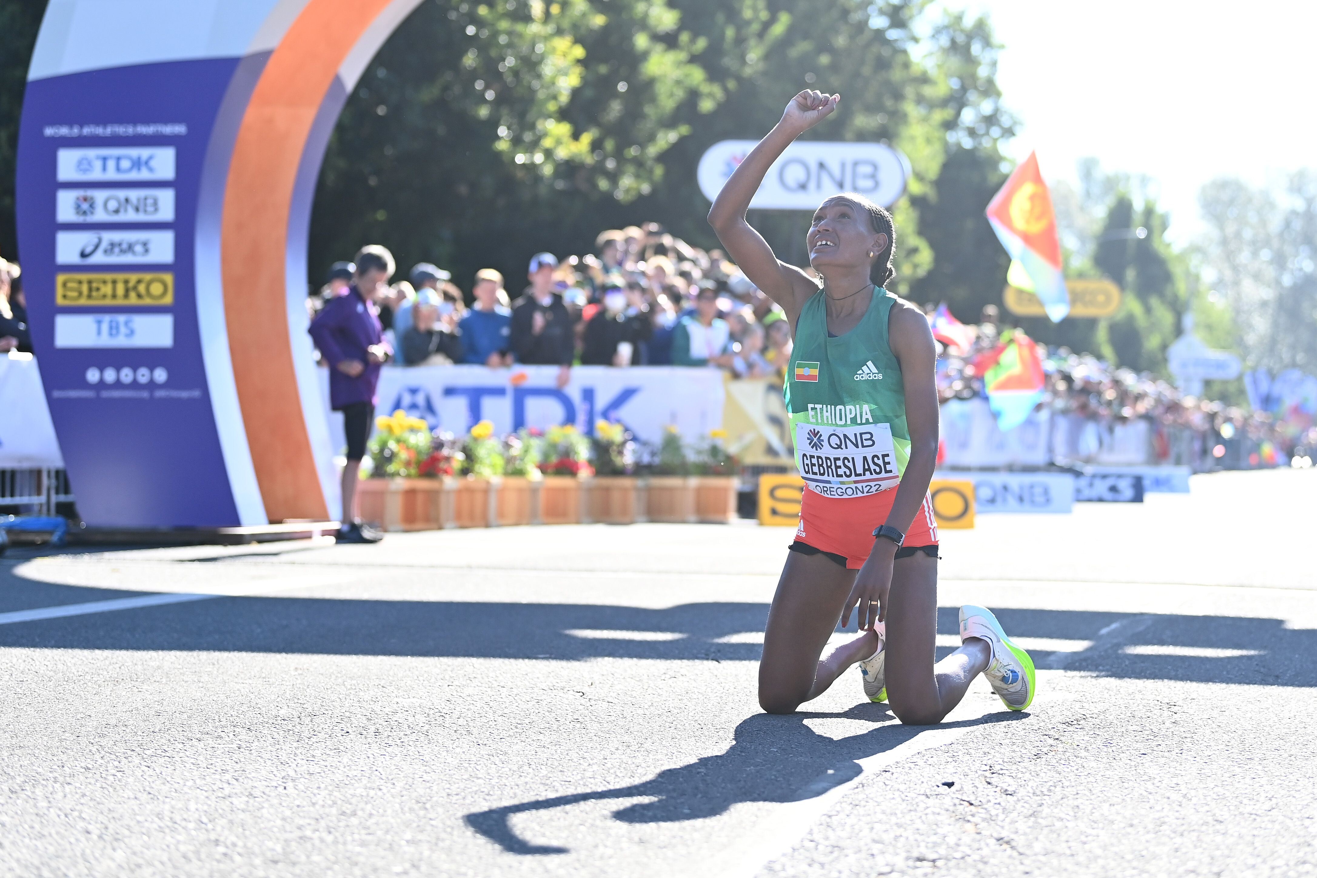 Kenyan world record holder Brigid Kosgei looked to be limping from the start and dropped out after just three minutes, while Ethiopia's defending champion Yalemzerf Yehualaw was fifth.