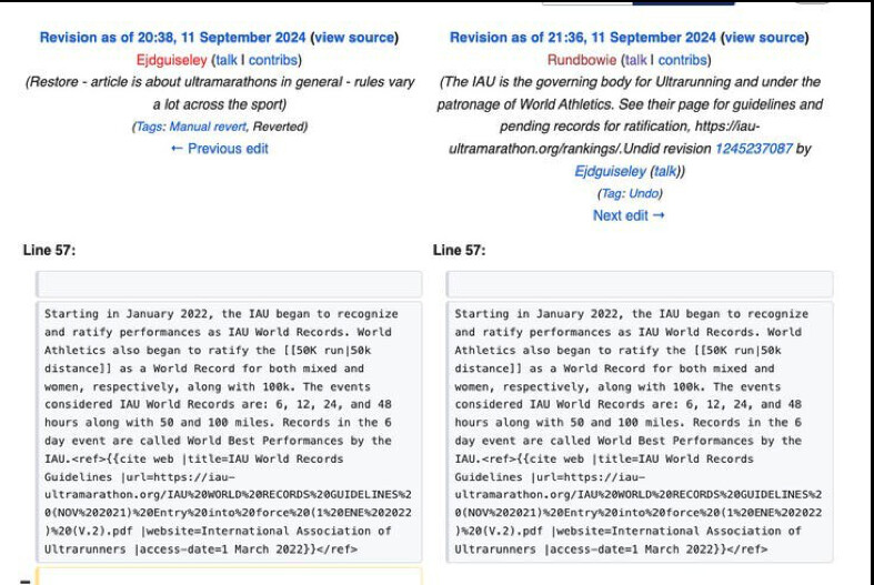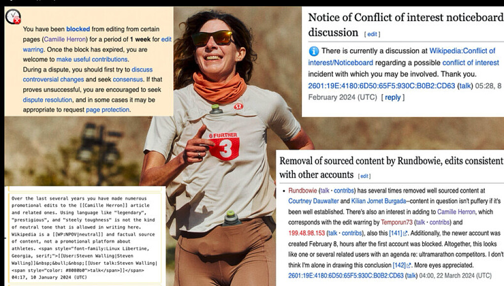 In September 2024, the ultrarunning community was shaken by a controversy involving American ultrarunner Camille Herron and her husband and coach, Conor Holt. The couple was accused of editing Wikipedia pages to enhance Herron's achievements while diminishing those of her competitors.