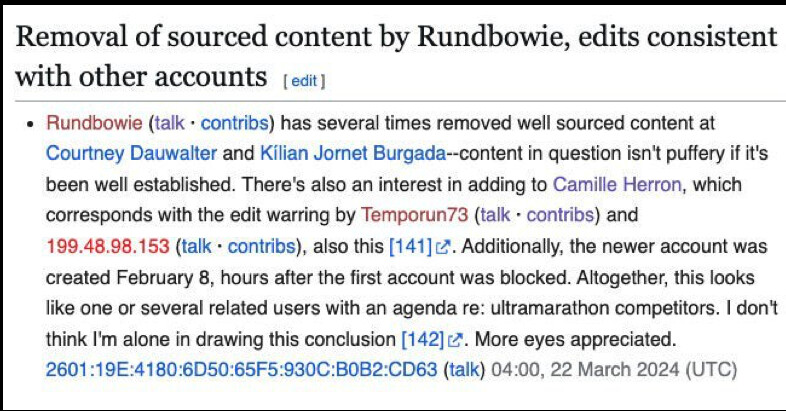 An investigation by Canadian Running revealed that two Wikipedia accounts, "Temporun73" and "Rundbowie," were linked to Herron's email and Holt's IP address. These accounts made numerous edits to Herron's page, amplifying her accomplishments, and altered the pages of fellow ultrarunners, including Courtney Dauwalter and Kilian Jornet, to downplay their achievements. For instance, statements like "widely regarded as one of the best trail runners ever" were removed from competitors' pages, while Herron was described as "widely regarded as one of the greatest ultramarathon runners of all time."