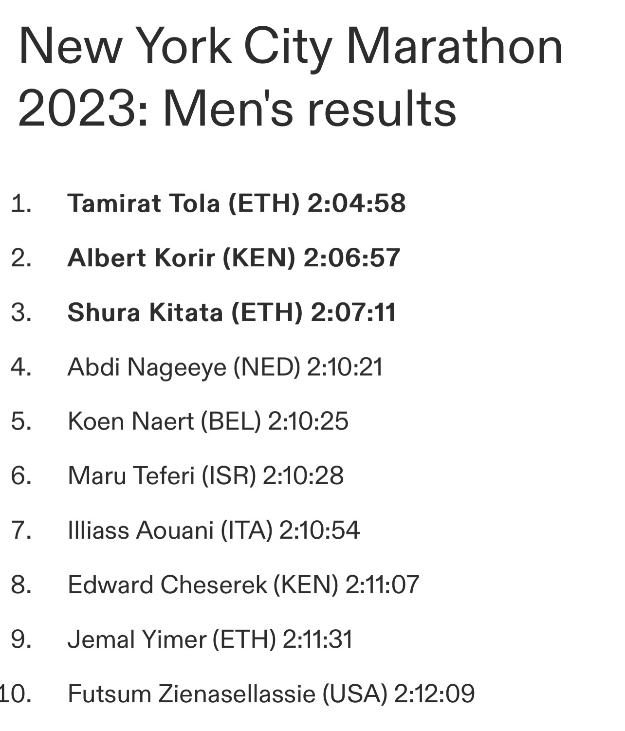 With his time of 2:04:58, Tola becomes the first athlete to dip under 2:05 in the New York City Marathon. Korir was second in a PB of 2:06:57, while Kitata was third in 2:07:11. Olympic silver medallist Nageeye finished fourth in 2:10:21 and Belgium’s Koen Naert came through for fifth in 2:10:25.