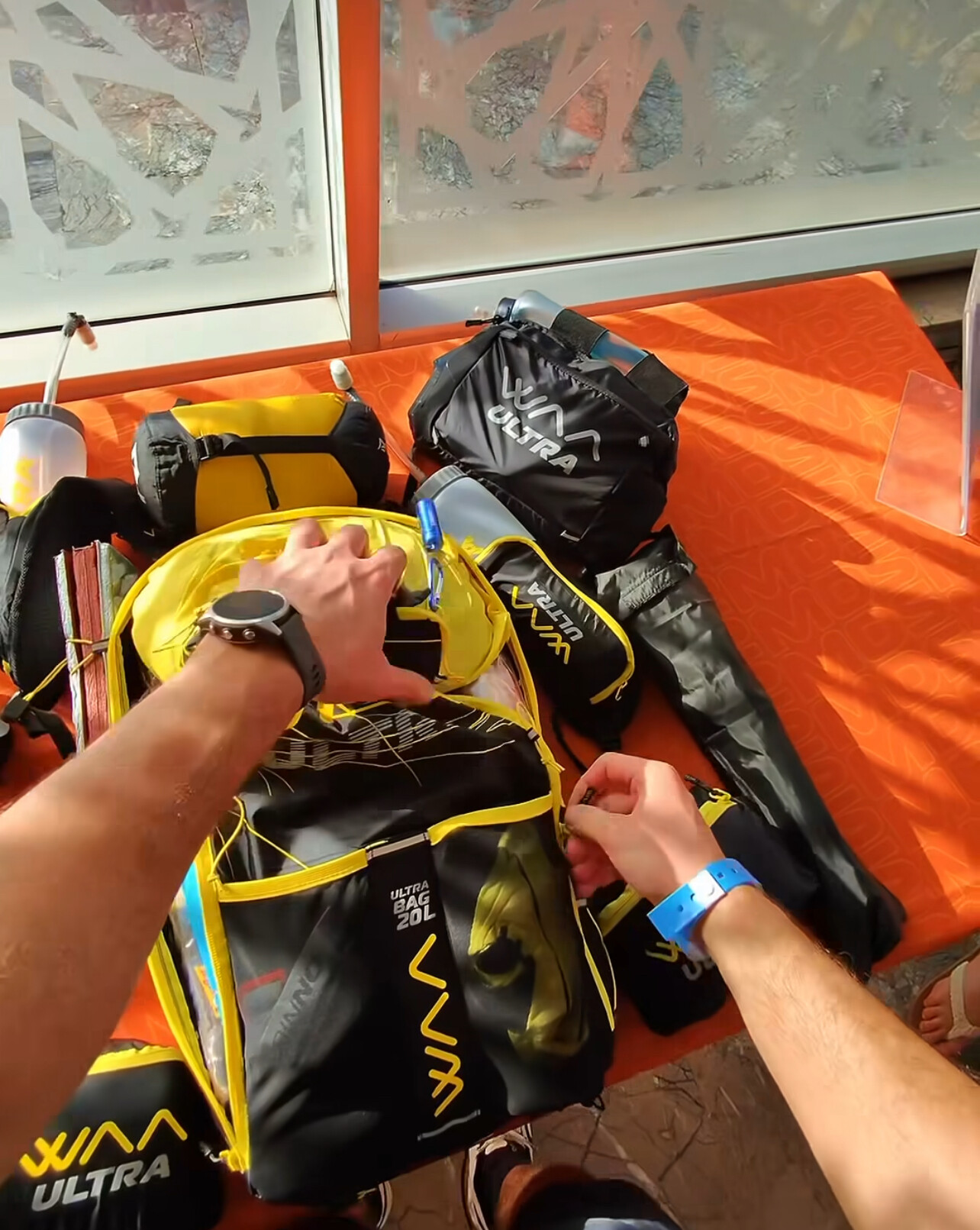 The participants carry their own gear and food for the whole race - the organizers provide water and an open tent. You must also be equipped with minimal survival equipment including a sleeping bag and a snakebite set.
