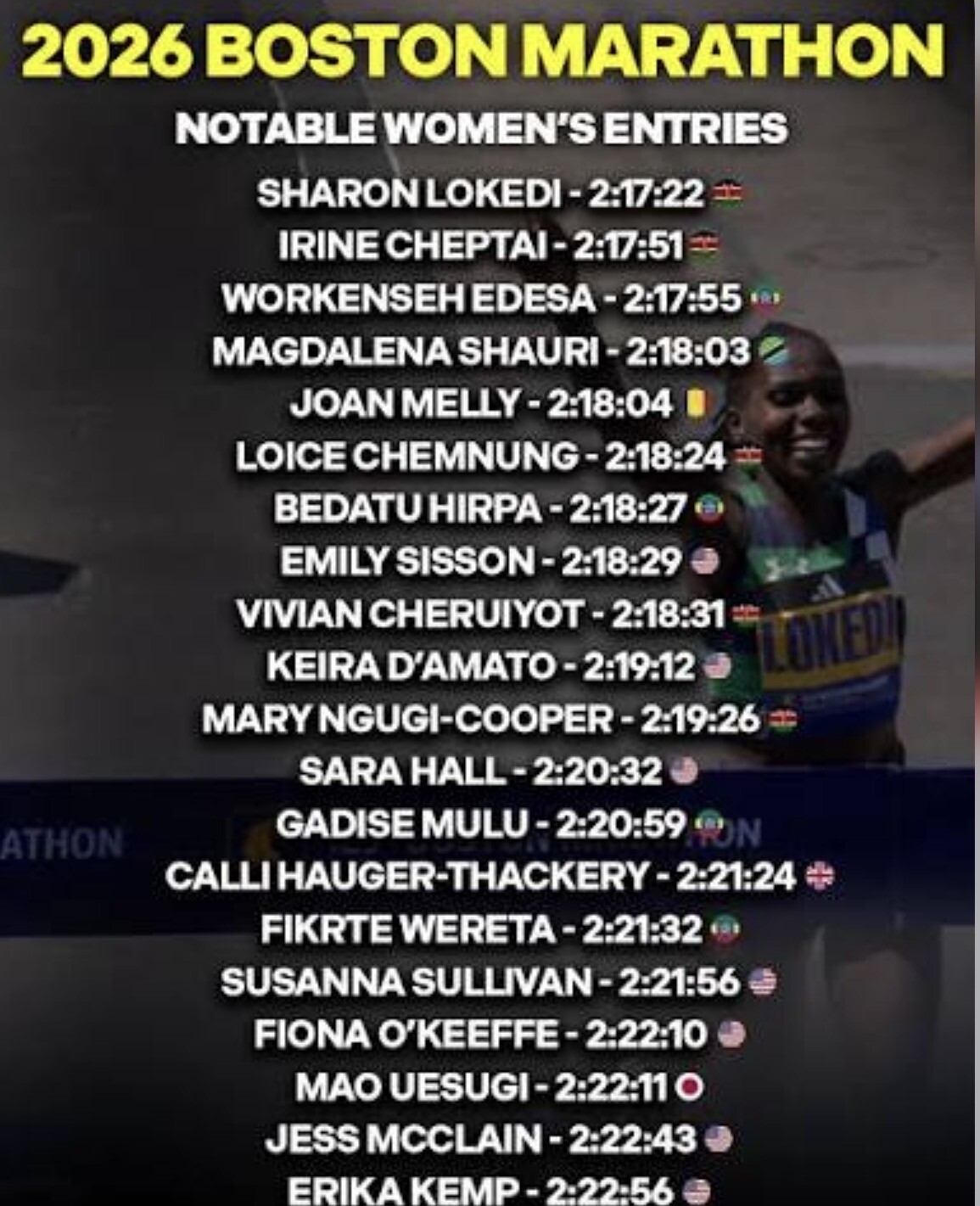 They’ll be challenged by Kenya’s Mary Ngugi-Cooper (2:20:22), while rising stars Loice Chemnung(marathon debut) and Ejgayehu Taye (track standout) add intrigue to the field.