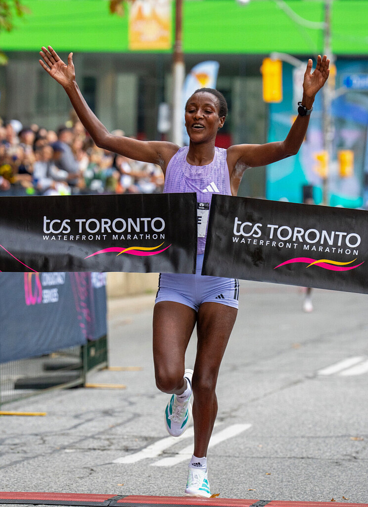 Ethiopia’s Shure Demise made history Sunday by winning her third TCS Toronto Waterfront Marathon, pulling away just after halfway and never looking back. Despite warm, windy, and humid conditions, she crossed the line in 2:21:03, the second-fastest time of her career—just 19 seconds shy of the course record set last year by compatriot Waganesh Mekasha.