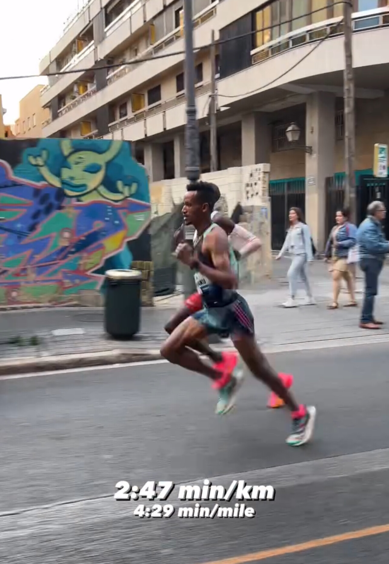 The lead pack continued at a steady 2:45/2:46 kilometre pace to reach 3km in 8:17 and halfway in 13:46. By then the lead group was still large and led by 40-year-old Spaniard Ayad Lamdassem.