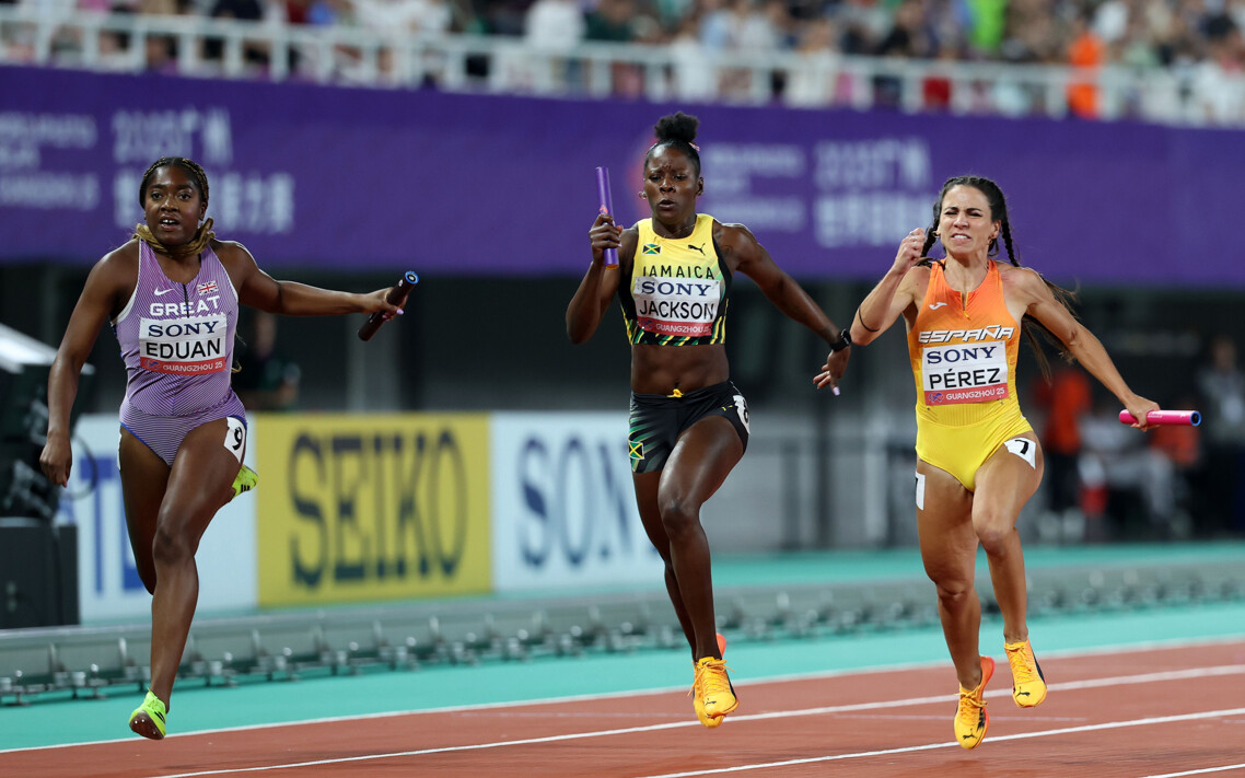 In the 4x100m final, Maria Perez held off a charging Shericka Jackson and Twanisha Terry to earn silver. “I was nervous,” Perez admitted. “But I just told myself: run faster.”