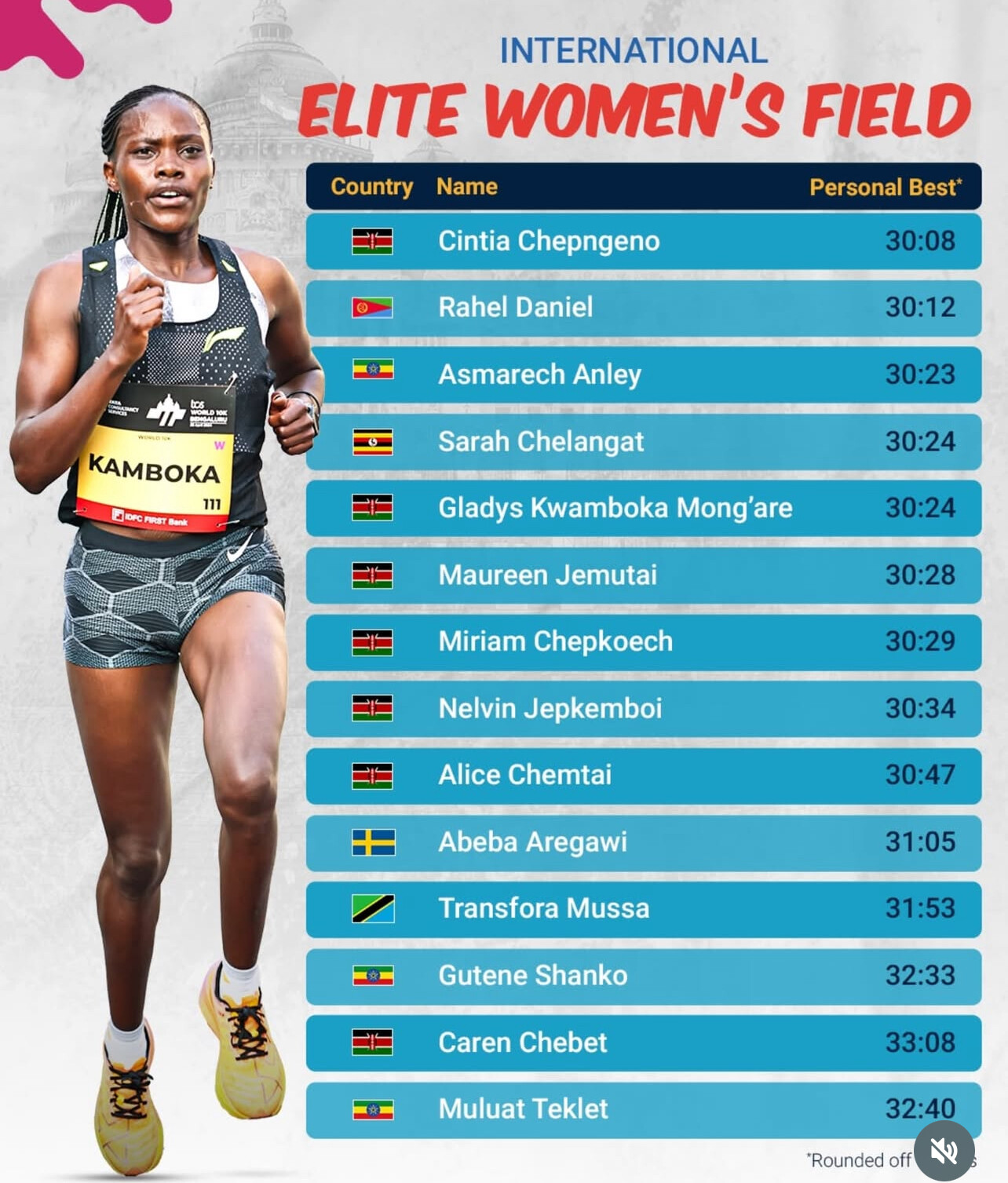 Five of her compatriots will also take the women's starting line-up in Bengaluru, with timings faster than the event course record (30:35).