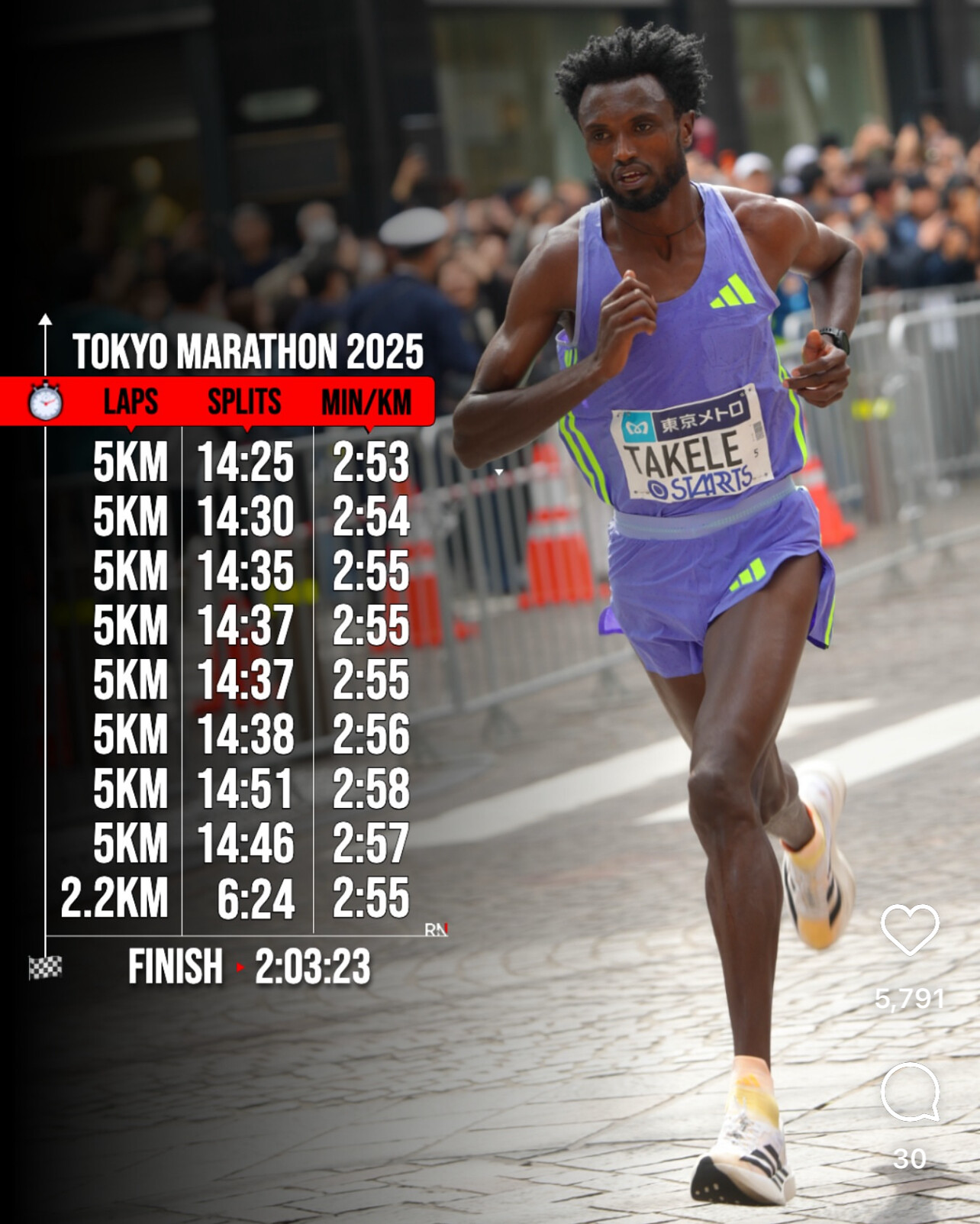 Assefa, still looking incredibly relaxed and composed, covered the next 10km segments in a remarkable 31:02, bringing her to 35km in 1:49:41. Her 30km split was 1:34:12, the second-fastest mark in history for that checkpoint (behind Ruth Chepngetich’s 1:34:01 from the 2022 Chicago Marathon).