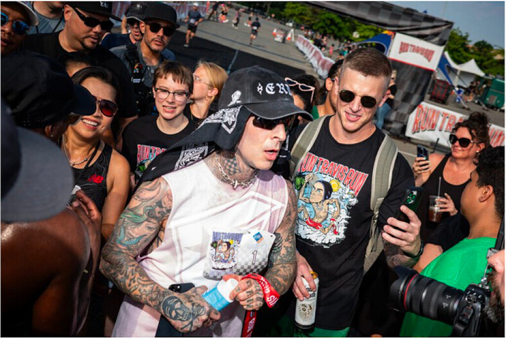 Three minutes later, I reach a small group of runners struggling to keep up with Travis Barker, the legendary drummer for Blink-182. He’s hauling, a black bandana flapping under his cap, phone in one hand, cardboard box of water in the other.