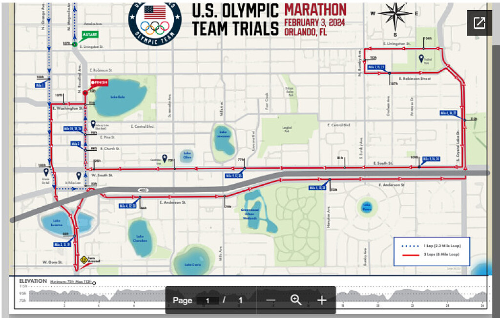 more...Just over six months out from race day, organizers revealed the course for the 2024 U.S. Olympic Team Trials – Marathon on Tuesday morning. The race, which will be held on February 3, 2024, in Orlando, Fla., will consist of one 2.2-mile loop through the downtown business district and three 8-mile loops through the city’s Milk District — so-called because it features the headquarters of T.G. Lee Dairy, which has been based in the area for 98 years. It will start and finish at the Walt Disney Amphitheater at Lake Eola Park. None of the course will run through Disney World, which is located to the southeast of the city of Orlando.