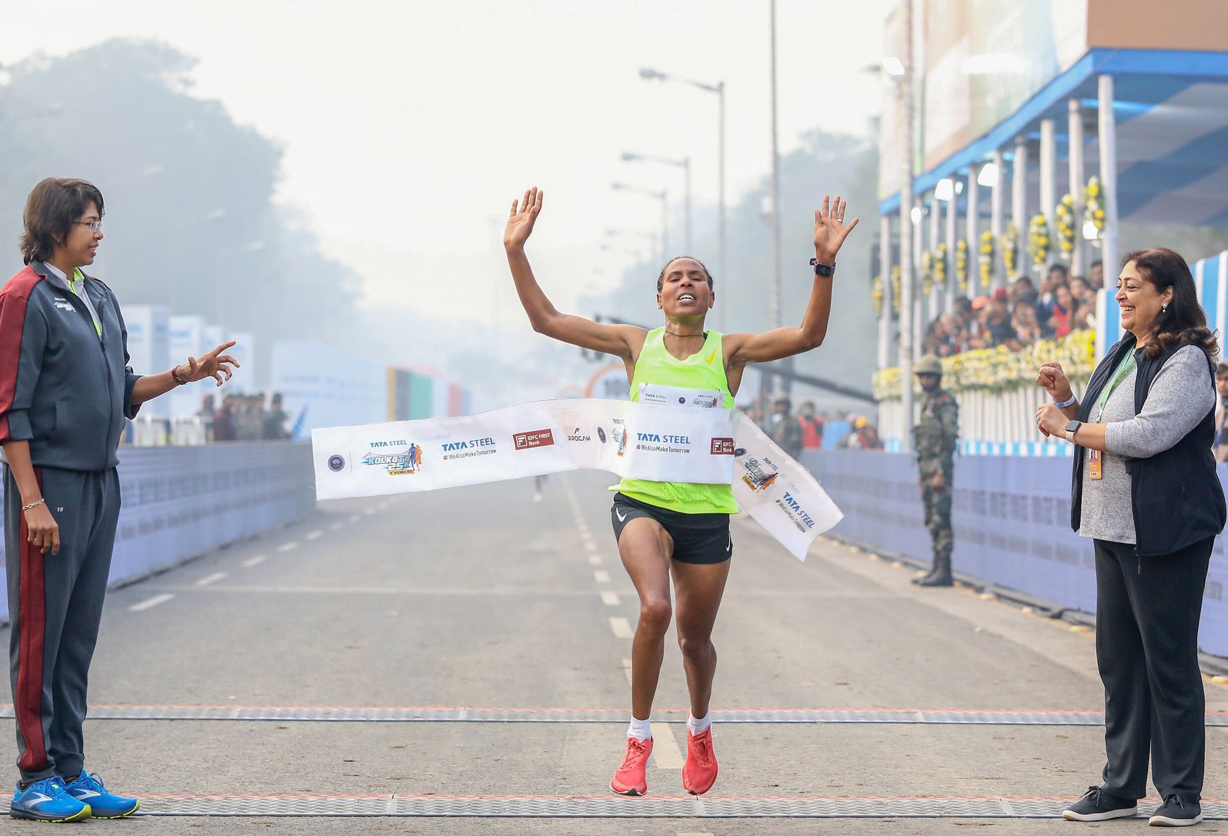 The men’s contest ultimately narrowed to a gripping duel between Ethiopia’s Tadu Abate Deme and Kenya’s Leonard Lang’at, with Eritrea’s Merhawi Kesete Weldemaryam remaining in contention deep into the race. As the decisive kilometres approached, the tension was unmistakable. “Neither of them giving any quarter. They’re both absolutely exhausted here,” commentators observed, capturing the mental and physical toll exacted by the Mumbai course.