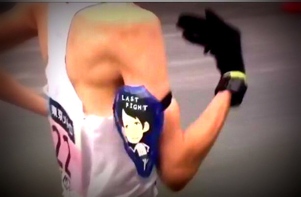 We asked our Japan's contributor Osamu Tada about the arm sleeve. "His family gave him his portrait," says Osamu. "Maybe it is a new way of cheering...as an aside his twin brother is going to run the Biwako Marathon this weekend."