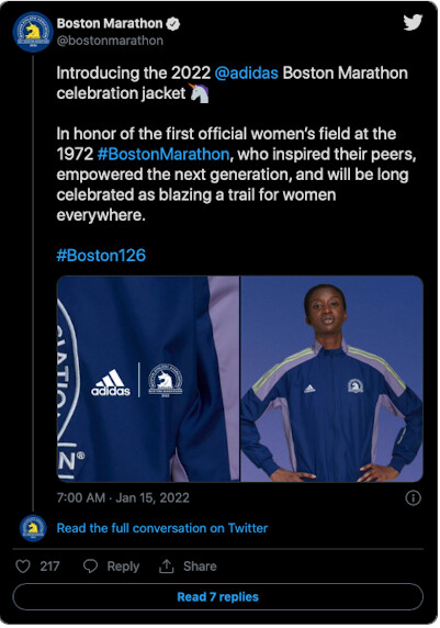 The 2022 Boston Marathon celebration jacket has been revealed on the Adidas site. This year’s blue, purple and green edition was designed to commemorate 50 years since eight women became the first ever to run a marathon in 1972.
