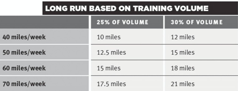 It may sound unconventional, but you'll find that it isn't random; these suggestions are all firmly based in science with proven results. As stipulated by Dr. Noakes, it is widely accepted among coaches that long runs shouldn't exceed 25-30 percent of weekly mileage. Even so, that guideline manages to get lost in many marathon-training programs in the effort to cram in mileage. For instance, a beginning program that peaks at 40-50 miles per week and recommends a 20-mile long run is violating the cardinal rule. Although the epic journey is usually sandwiched between an easy day and a rest day, there is no getting around the fact that it accounts for around 50 percent of the runner's weekly mileage. Looking at the table below, you can see how far your long run should be based on your total mileage for the week.