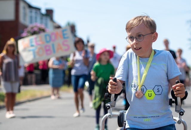Cerebral palsy is a group of neurological disorders that affect the ability to move. According to his JustGiving page, Tobias cannot stand or walk unaided, and requires support with most tasks, but, inspired by Captain Tom Moore, a war veteran who raised millions for the UK's National Health Service by walking laps of his garden ahead of his 100th birthday, Tobias set his sights on a marathon.