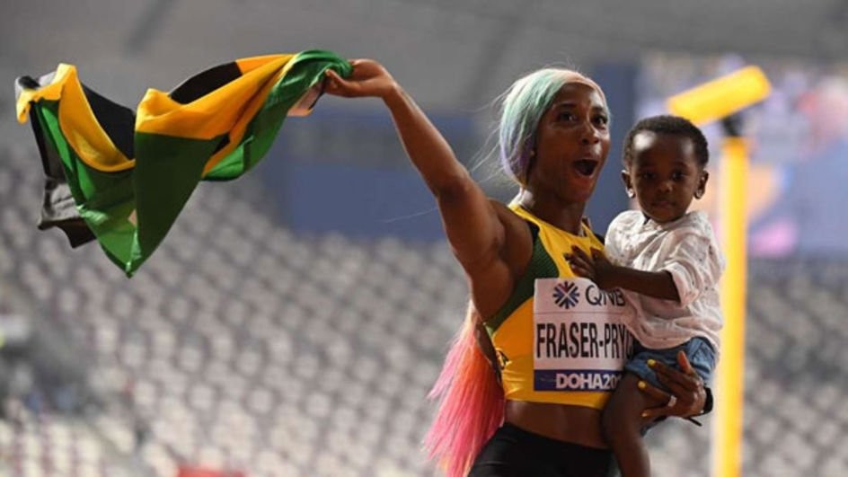 Her latest win in Qatar saw the introduction of her son Zyon to the world, as the Jamaican proudly ran her victory lap with the two-year-old boy in her arms.