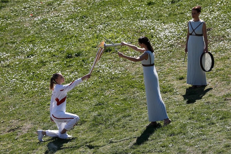 Greek actress Xanthi Georgiou used a parabolic mirror to ignite the torch on Thursday before handing it to Greek Olympic shooting champion Anna Korakaki, who became the first woman to be the first torchbearer of the torch relay. The gold medalist at the 2016 Rio Games then passed the flame to Japan’s Mizuki Noguchi, who won the gold medal in the marathon at the 2004 Athens Games.