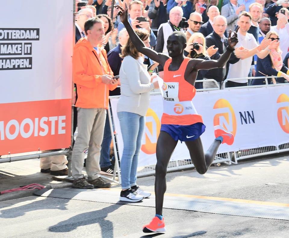 With a slight increase in pace in the final stages, Kipserem eventually crossed the finish line on the Coolsingel in 2:04:11 to take 16 seconds off the course record set 10 years ago.