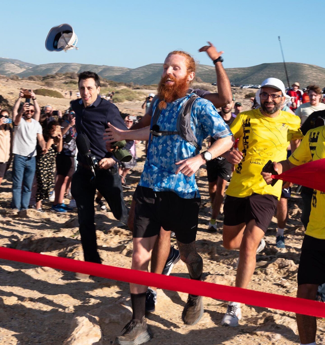 As he crossed the finish line at about 16:40 BST in Ras Angela, Tunisia, Mr Cook was greeted by a shouting crowd, with many chanting "geezer".