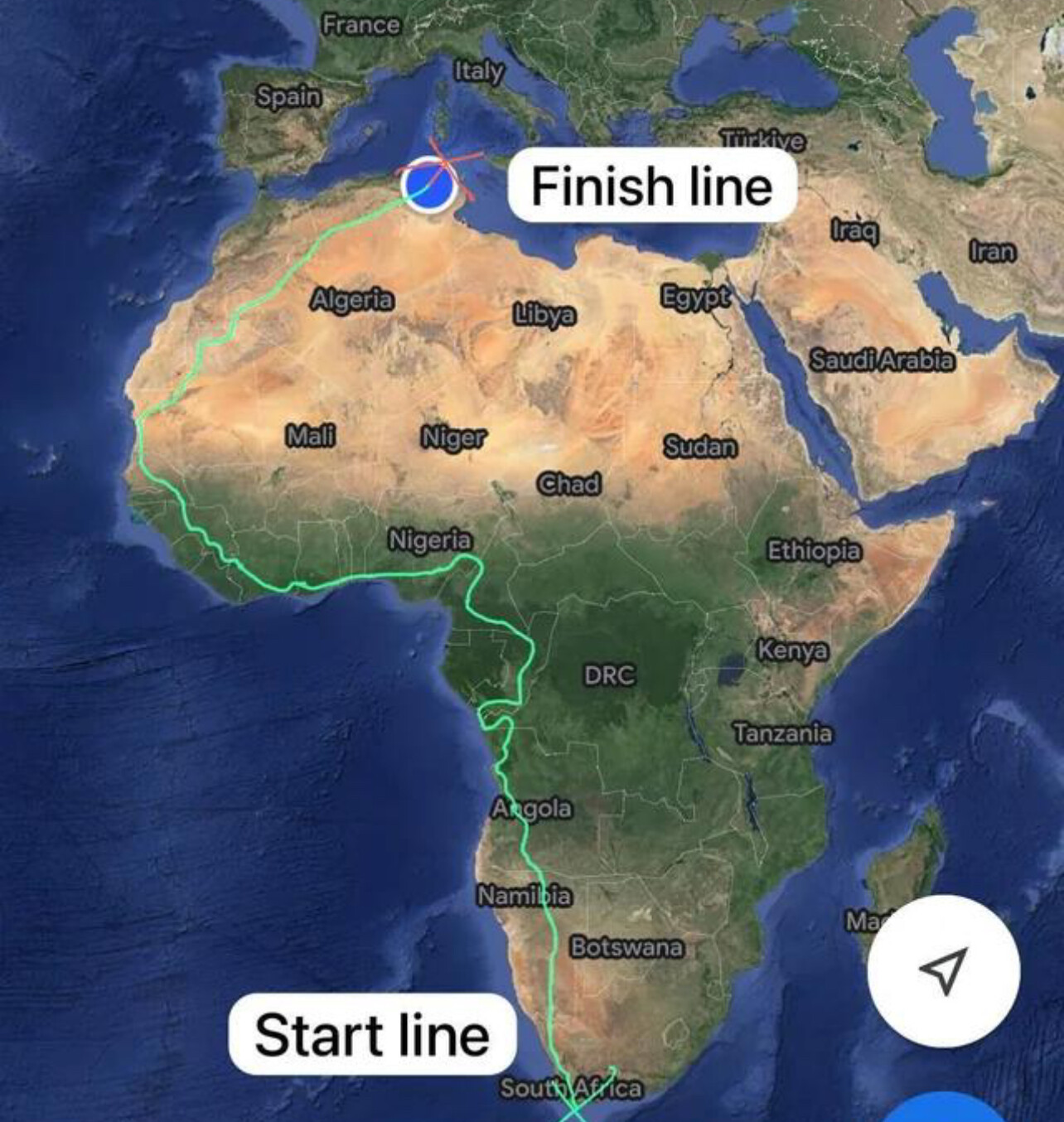 But after a last-minute switch, he set off on foot from South Africa's most southerly point on 22 April - a journey that would take him through cities, rainforests, mountains and the Sahara Desert.