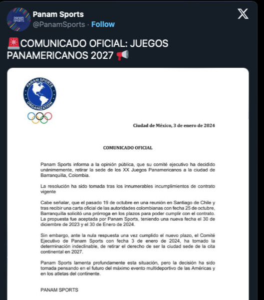 “Given the lack of response in accordance with the new financial deadline, the PASO executive committee made the decision on Jan. 3, 2024, to withdraw the right to be a host city of the continental event in 2027,” PASO said in a translated statement posted on social media.
